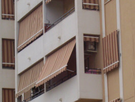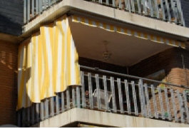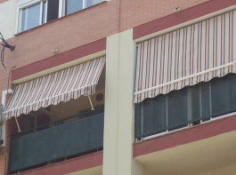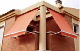 Toldo práctico que puede instalarse en posición vertical o fijado a la barandilla mediante brazos. Permite ajustar la inclinación según la necesidad de sombra, ofreciendo mayor versatilidad y comodidad en balcones y terrazas.